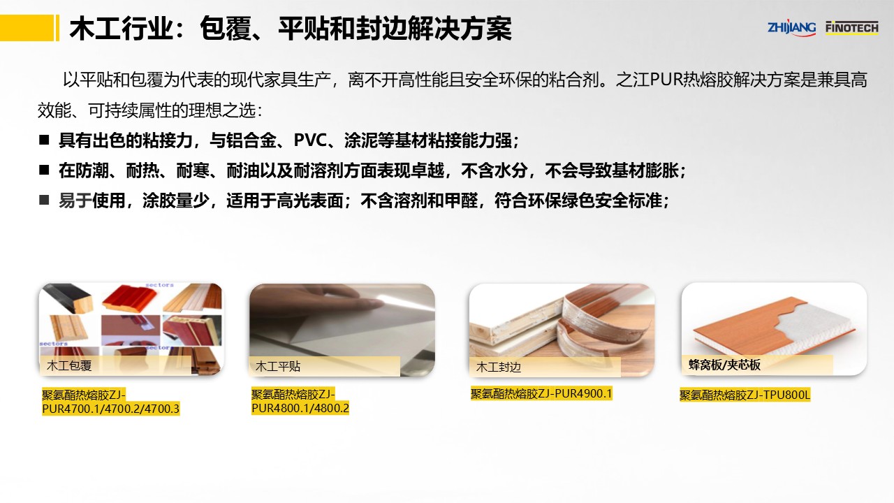 之江公司立足于中國膠粘劑行業(yè)領(lǐng)軍企業(yè)和有機硅膠、聚氨酯、環(huán)氧等專業(yè)膠粘劑的創(chuàng)新和產(chǎn)業(yè)化優(yōu)勢,具有國家高新技術(shù)企業(yè)和國家級企業(yè)技術(shù)中心資質(zhì),依靠國家級CNAS實驗室以及國家級博士后科研工作站,并有國際專家助力,可為木工行業(yè)提供包覆、平貼、封邊應(yīng)用的聚氨酯熱熔膠粘接解決方案,推出了如下產(chǎn)品: