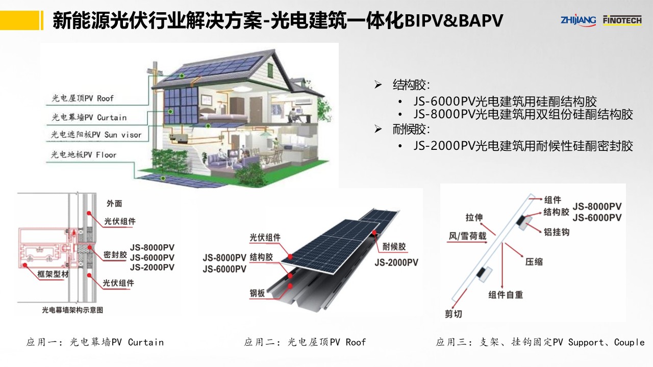 之江公司依托密封膠領(lǐng)域多年的創(chuàng)新平臺,推出了優(yōu)異的光伏行業(yè)用膠解決方案以及光電建筑一體化解決方案,開發(fā)出了性能優(yōu)異的JS-6000PV/JS-8000PV光電建筑用結(jié)構(gòu)膠、JS-2000PV光電建筑用耐候膠等有機(jī)硅系列品種,應(yīng)用于光電建筑幕墻、光電屋頂、組件掛鉤粘接等方面。